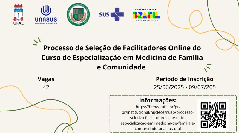 Edital e formulário de inscrição: https://famed.ufal.br/pt-br/institucional/nucleos/nusp/processo-seletivo-facilitadores-curso-de-especializacao-em-medicina-de-familia-e-comunidade-una-sus-ufal