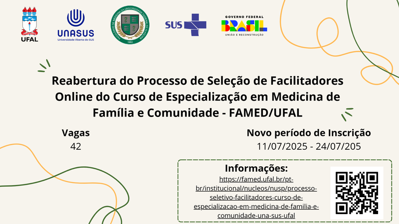 A Comissão do Processo Seletivo da Universidade Federal de Alagoas (UFAL) informa que o Edital UNA-SUS/UFAL nº 02/2025, referente à seleção de facilitadores para atuarem na oferta do Curso de Pós-Graduação Lato Sensu – Especialização em Medicina de Família e Comunidade, na modalidade EAD, no âmbito da execução em rede do Programa Mais Médicos para o Brasil (PMMB), foi cancelado exclusivamente pela UFAL, de forma independente das demais instituições de ensino superior participantes da rede UNASUS. O cancelamento aconteceu em razão de problemas técnicos e operacionais identificados no sistema de inscrições sob responsabilidade da UFAL.