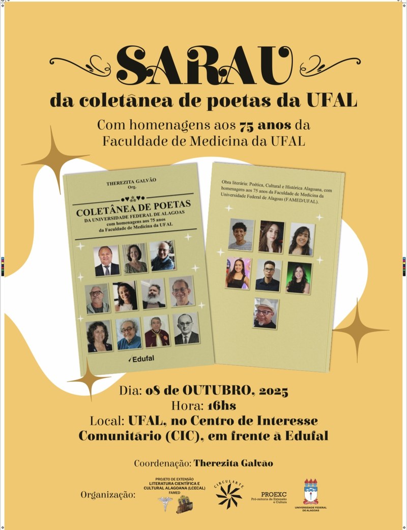 É um evento cultural e social organizado pelo Projeto de extensão: Literatura Científica e Cultural Alagoana - LCECAL/FAMED/UFAL. Sob a coordenação da profa. Therezita Galvão. O qual foi selecionado e irá acontecer durante o CIRCULARTE da Pró-Reitoria de Extensão e Cultura (PROEX) da UFAL, no dia 08/10/2025, às 16hs, com duração de 2h, na UFAL, no local: Centro de Interesse Comunitário (CIC), Campus A.C. Simões, em frente à entrada da EDUFAL.